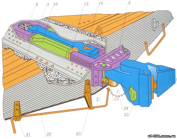 1-автосцепка; 2-маятниковые подвески; 3-болты М22; 4-ударная розетка; 5-нижняя полка хребтовой балки; 6-опорные части; 7-вертикальная полка хребтовой балки; 8-задний упор; 9-тяговый хомут; 10-поглощающий аппарат; 11-поддерживающая планка; 12-упорная плита; 13-центирующая балочка; 14-клин тягового хомута; 15-передний упор; 16-провоолока диаметром 4 мм; 17-гайки; 18-запорная планка; 19-болты М22 с запорной шайбой; 20-рукоятка расцепного рычага; 21-кронштейн; 22-стержень расцепного рычага; 23-державка; 24-цепь расцепного привода; 25-валик подъемника