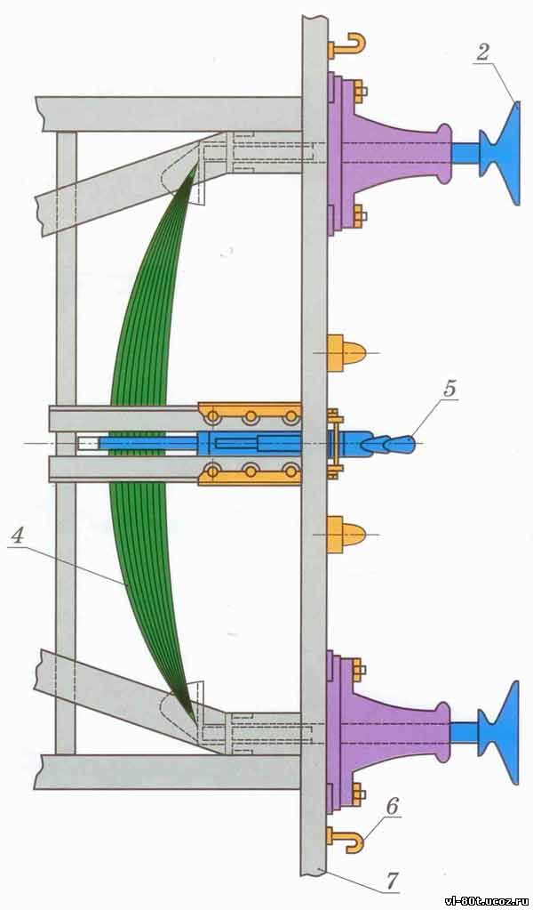 1-шкворень; 2-буфер; 3-серьга; 4-листовая рессора; 5-сцепка; 6-крюк;